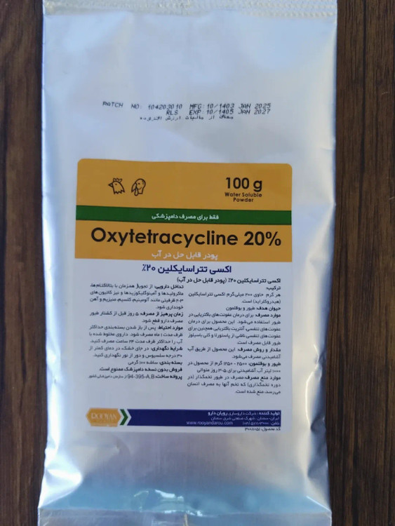 موارد مصرف: اکسی تتراسایکلین 20 % جهت درمان عفونتهای باکتریایی در طیور استفاده میشود. این محصول برای درمان عفونتهای تنفسی، آنتریت باکتریایی همچنین برای عفونتهای تنفسی ناشی از پاستورلا و کلی باسیلوز طیور قابل مصرف میباشد. مقدار و نحوه مصرف: اکسی تتراسایکلین 20 % از طریق آب آشامیدنی مصرف میشود. طیور و بوقلمون: 2500 – 1250 گرم از محصول در 1000 لیتر آب آشامیدنی برای 5 – 3 روز متوالی موارد منع مصرف: مصرف در طیور تخمگذار (در دوره تخمگذاری) که تخم آنها به مصرف انسان میرسد منع شده است. تداخل دارویی: از تجویـز همـزمان با بتالاکتـامها، ماکرولیـدها و آمینوگلیکوزیدها و نیز کاتیونهای 5 – 2 ظرفیتی مانند آلومینیم، کلسیم، منیزیم و آهن خودداری گردد. زمان پرهیز از مصرف: 5 روز قبل از کشتار طیور مصرف دارو قطع گردد. موارد احتیاط: پس از باز شدن بستهبندی حداکثر ظرف مدت 1 ماه مصرف گردد. داروی مخلوط شده با آب را حداکثر ظرف مدت 24 ساعت مصرف نمایید.