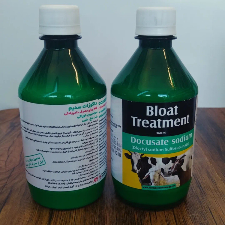 1.داکوزات سدیم (Docusate Sodium) یا دیاکتیل سولفوسوکسیلات این ماده یک عامل فعال سطحی (سورفکتانت) است که باعث کاهش کشش سطحی حبابهای گاز در شکمبه میشود. به این ترتیب، حبابها میترکند و گاز آزاد میشود و نفخ کاهش مییابد. معمولاً در درمان نفخ کفآلود (frothy bloat) در گاو و گوسفند استفاده میشود. اثر سریع و ایمن در شکستن کف گازی دارد..
