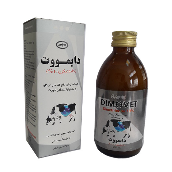 مشخصات دارویی: دایمتیکون یک پلیمر متیل سیلیکون می باشد که از طریق کاهش کشش سطحی در داخل شکمبه، کف را از بین برده و از تشکیل آن نیز جلوگیری می کند. موارد مصرف: بعلت دارا بودن اثر ضد کفی، بهترین درمان برای نفخ کفدار در گاو و نشخوارکنندگان کوچک است
